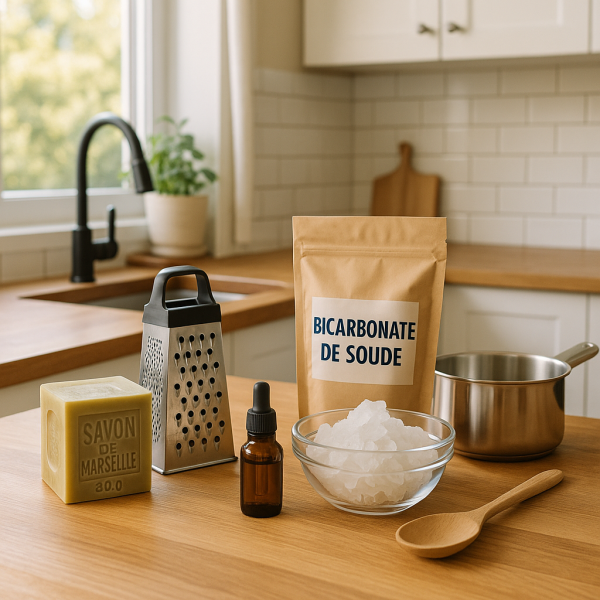Avant de te lancer, tu auras besoin de quelques ingrédients essentiels. Voici les incontournables pour concocter une lessive efficace.
